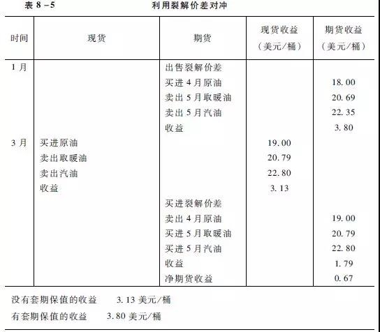 该炼油商在期货市场上进行了平仓。以54.29美分/加仑以及49.50美分/加仑的价格分别买进汽油和取暖油,以19美元/桶的价格卖出原油,整个卖出裂解价差头寸的收益为67美分/加仑。如果该炼油商没有套期保值,他的收益仅限于3.13美元/桶,实际上,他的收益为3.13+0.67=3.80美元/桶,这与他当初的设想完全一致。操作见表8-5。